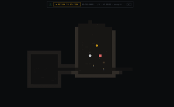 - SCAN a signal at the Station. Each one generates a deterministic site — floor count, layout, enemies, boss, all locked to the seed.
